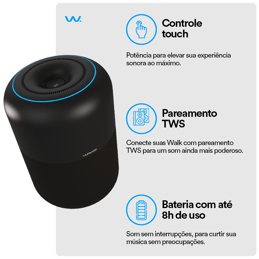 Com um som de extrema qualidade você terá um show em qualquer lugar. Controle o volume apenas com o toque, basta deslizar o dedo no sentido horário ou anti/horário para aumentar ou diminuir o volume. Além disso com a tecnologia TWS você pode emparelhar até duas caixas de som WaveONE Walk e ter um som estéreo, elevando sua experiência!
