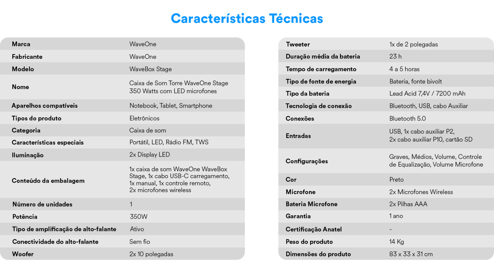 CAIXA DE SOM BLUETOOTH AMPLIFICADA WAVEONE STAGE COM LED