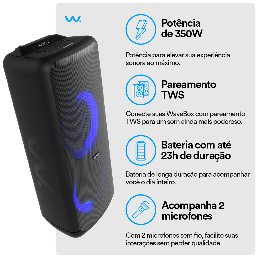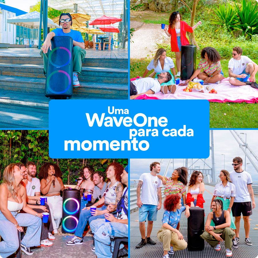 As WaveBox, além de potentes, são fáceis de transportar, com leds integrados essenciais para animar qualquer festa.