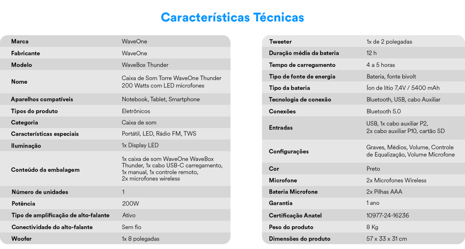 CAIXA DE SOM BLUETOOTH AMPLIFICADA WAVEONE THUNDER COM LED