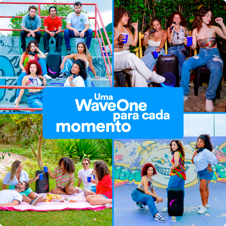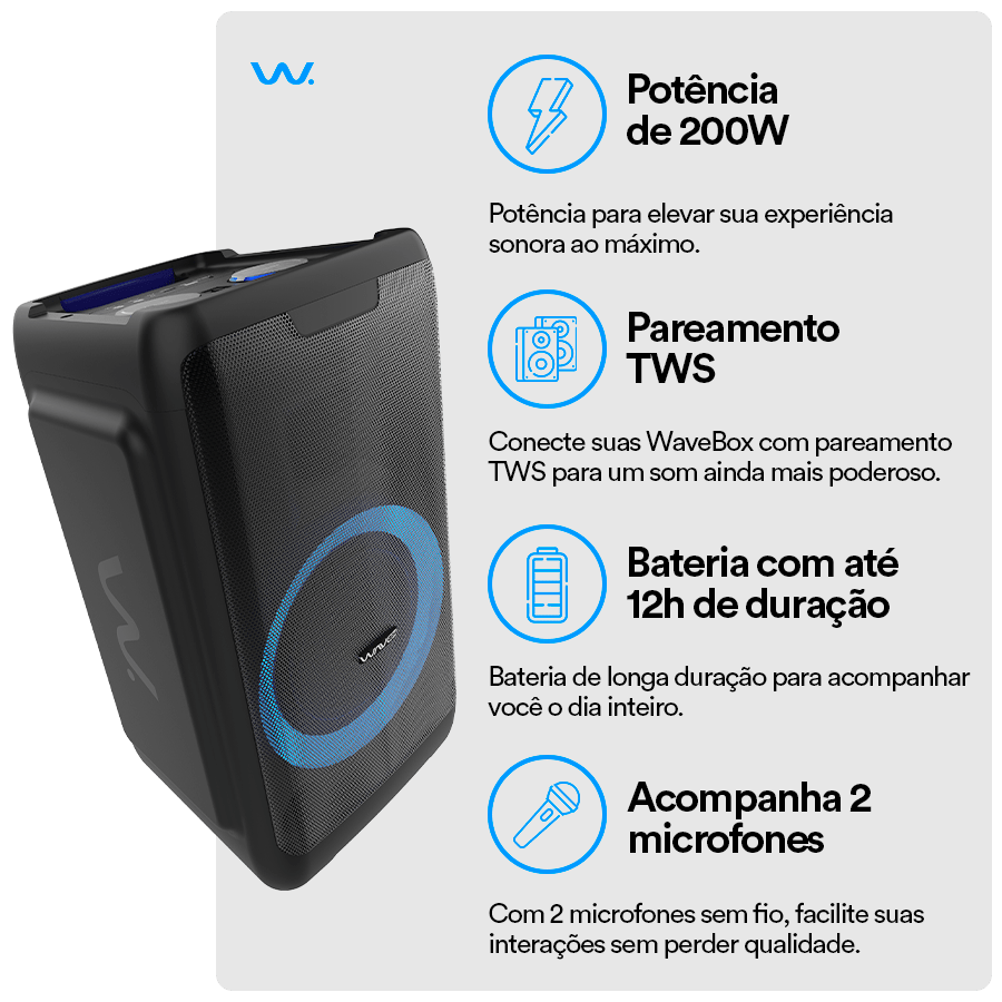 As WaveBox, além de potentes, são fáceis de transportar, com leds integrados essenciais para animar qualquer festa.