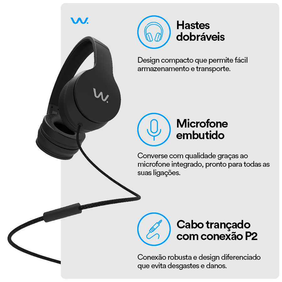 Compacto, dobrável e fácil de transportar: Esqueça as preocupações com espaço: o Fone de Ouvido WaveOne WF100 é dobrável e compacto, além de ser fácil de transportar!